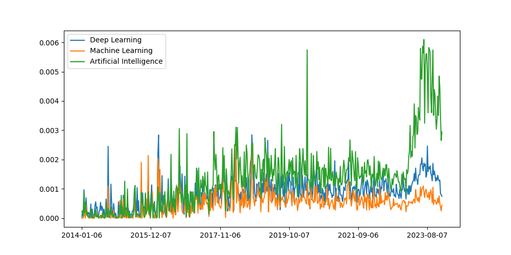 Signal of AI related terms, Deep Learning, Machine Learning, and Artificial Intelligence.