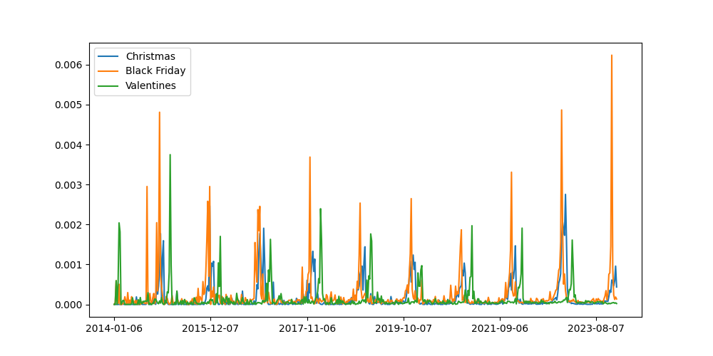 Signal of Christmas, Black Friday, and Valentines mentions (mostly by retailers).